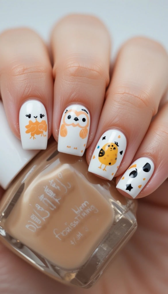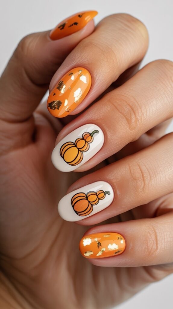 A mix of orange and white nails features cute pumpkins and gold leaf accents. The warm tones add a festive, autumnal charm to the short, oval shape.