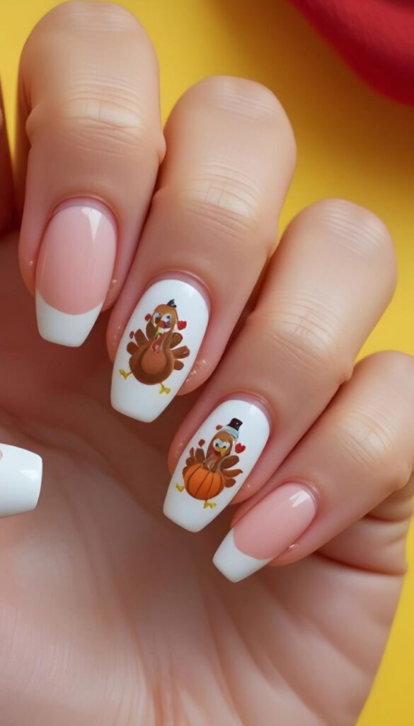 A white base features two adorable turkeys — one with a hat and one holding a pumpkin. The playful details add a fun, festive vibe to the short, almond shape.