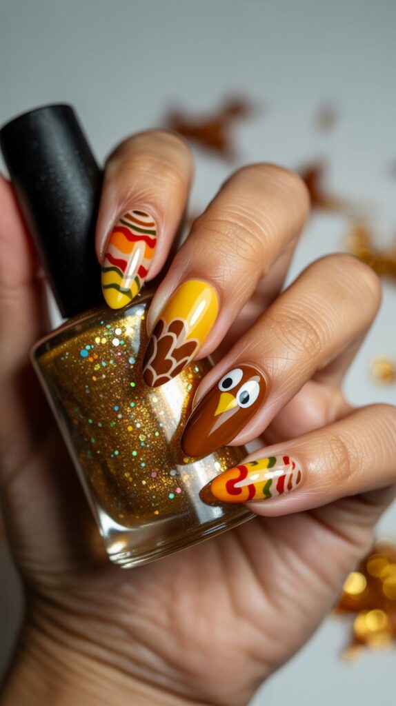 A mix of yellow, brown, and striped nails features a cute turkey face and feather patterns. The vibrant design adds a playful, festive charm to the short, almond shape.