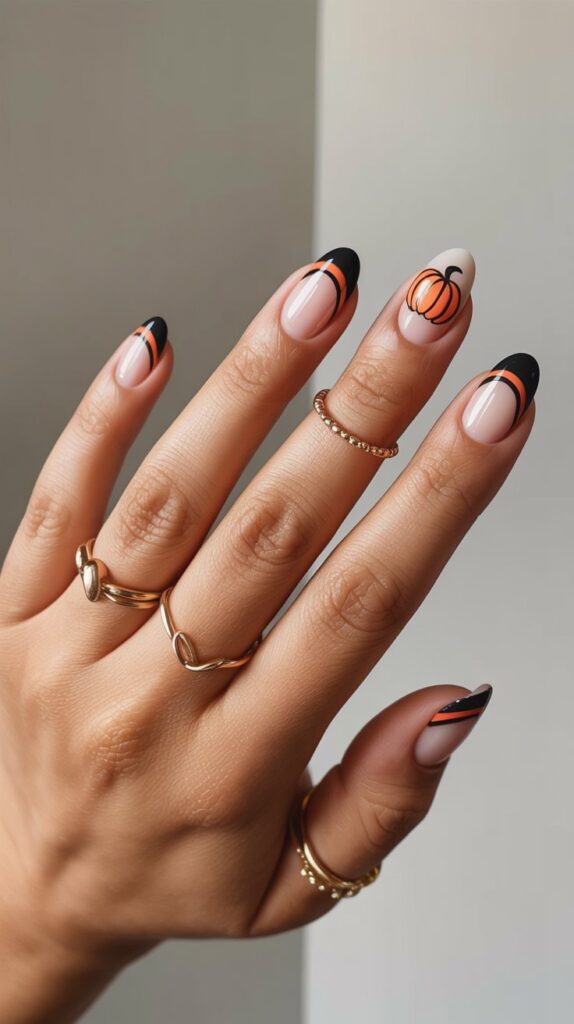 A soft pink base features black and orange French tips with one accent nail showcasing a tiny pumpkin. The elegant contrast adds a modern, seasonal charm to the short, almond shape.