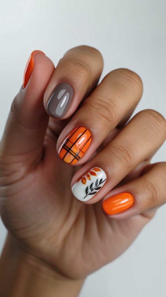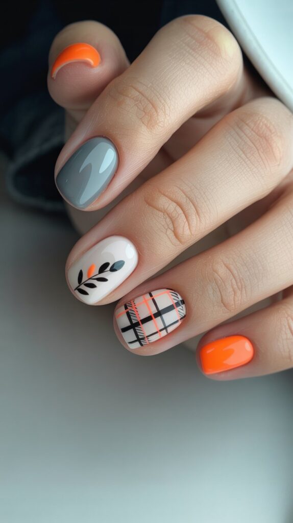 A mix of gray, orange, and plaid nails features a tiny leaf design. The modern contrast adds a stylish, seasonal charm to the short, rounded shape.