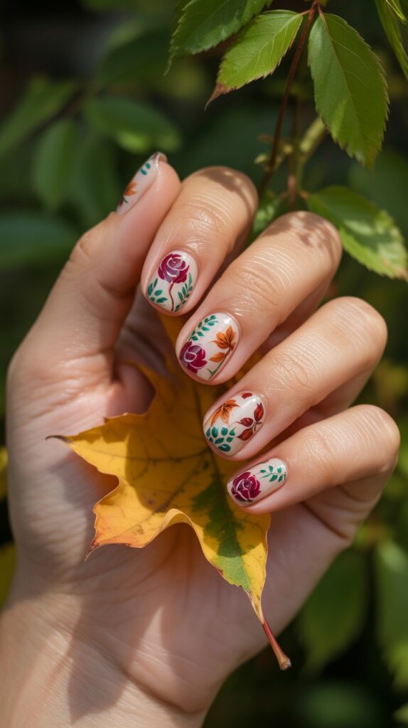 A white base features red roses, green leaves, and orange maple leaves. The elegant design adds a natural, artistic charm to the short, square shape.