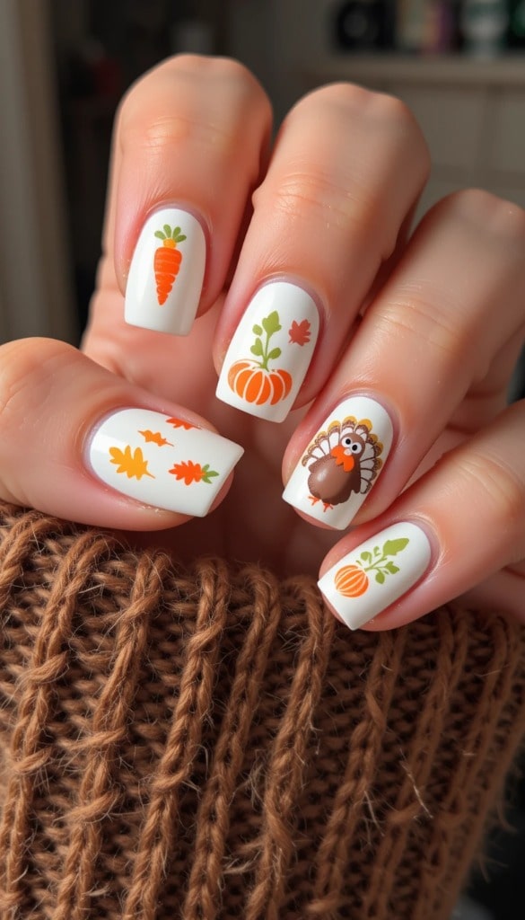 A white base features cute turkeys, pumpkins, carrots, and fall leaves. The colorful details add a playful, harvest-inspired charm to the short, square shape.