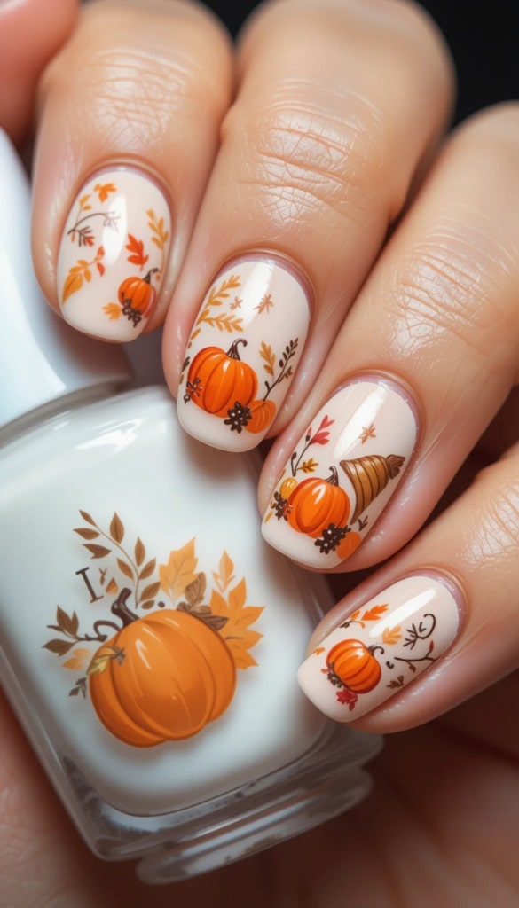 A nude base features orange pumpkins, acorns, and autumn leaves. The warm tones add a classic, seasonal flair to the short, oval shape.