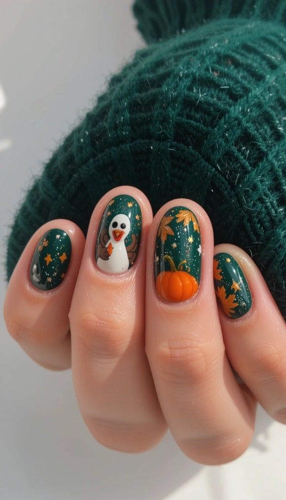 A deep green base features a snowman, pumpkin, stars, and autumn leaves. The whimsical contrast adds a cozy, holiday-ready flair to the short, oval shape.