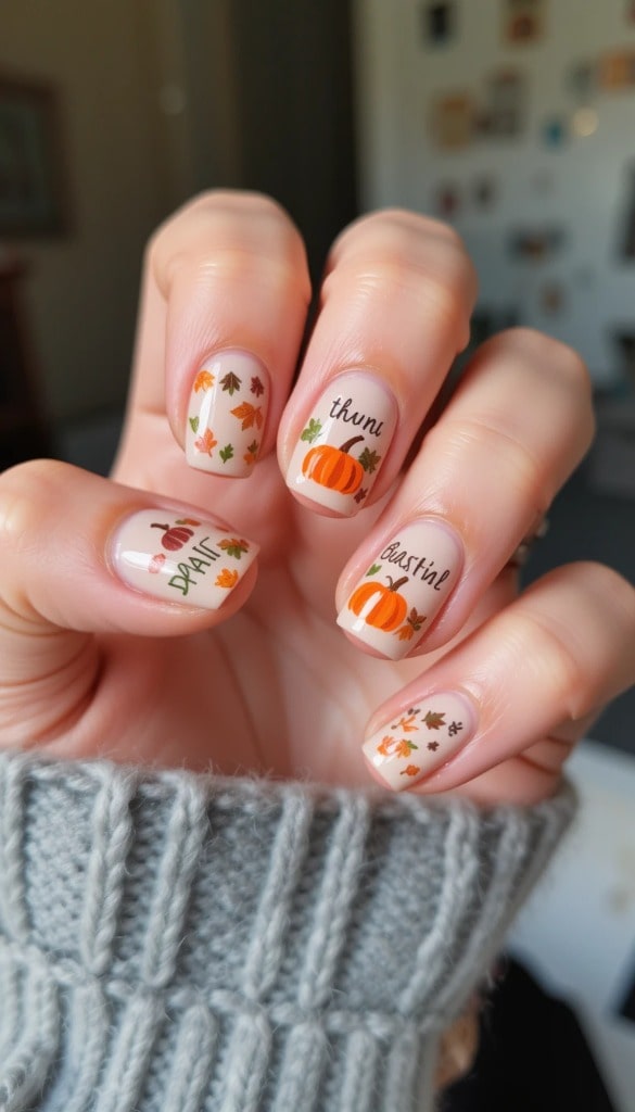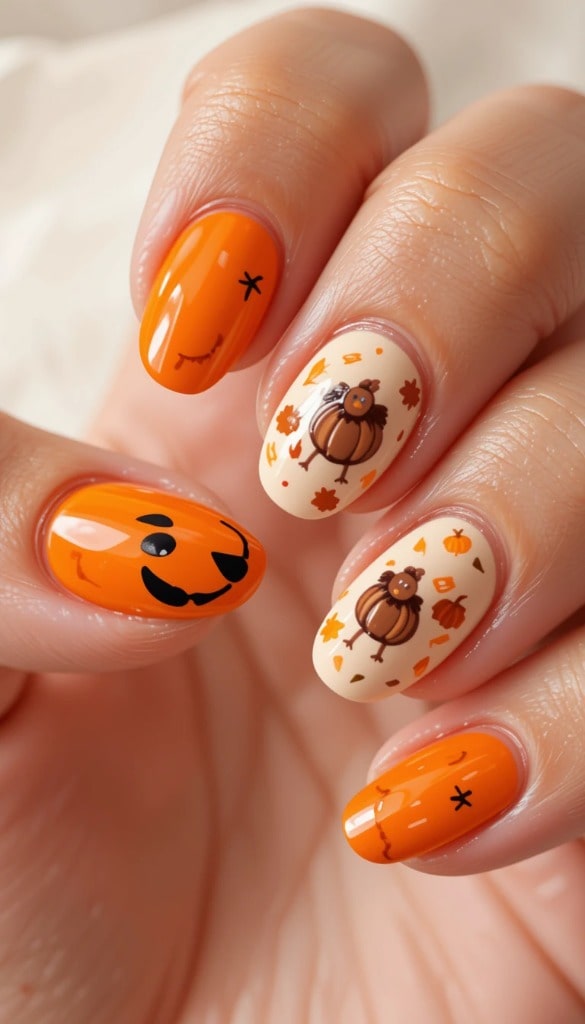 A mix of orange and beige nails features smiling jack-o’-lanterns and cute turkeys. The playful details add a festive, joyful vibe to the short, square shape.