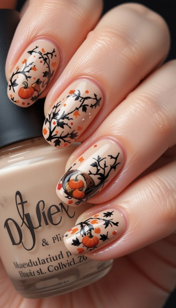 A nude base features black branches, orange pumpkins, and tiny leaves. The artistic design adds a natural, earthy charm to the short, oval shape.