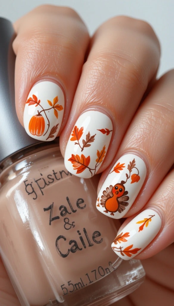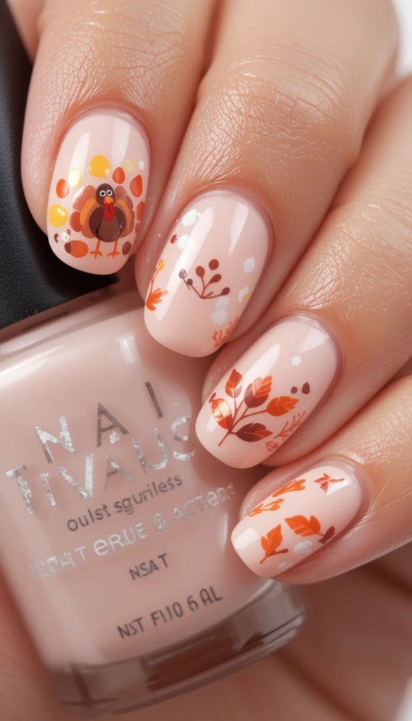 A soft pink base features a cute turkey, leaf patterns, and tiny polka dots. The delicate details add a cozy, festive touch to the short, oval shape.