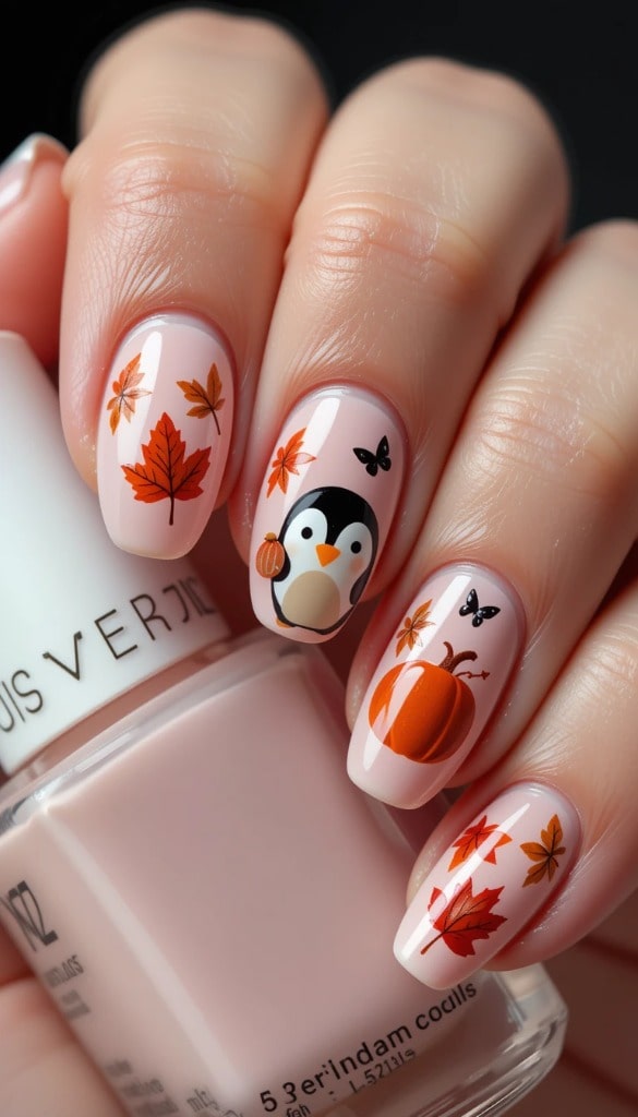 A soft pink base features a penguin, pumpkin, maple leaves, and butterflies. The fun mix of fall and winter themes adds a whimsical, festive vibe to the short, oval shape.