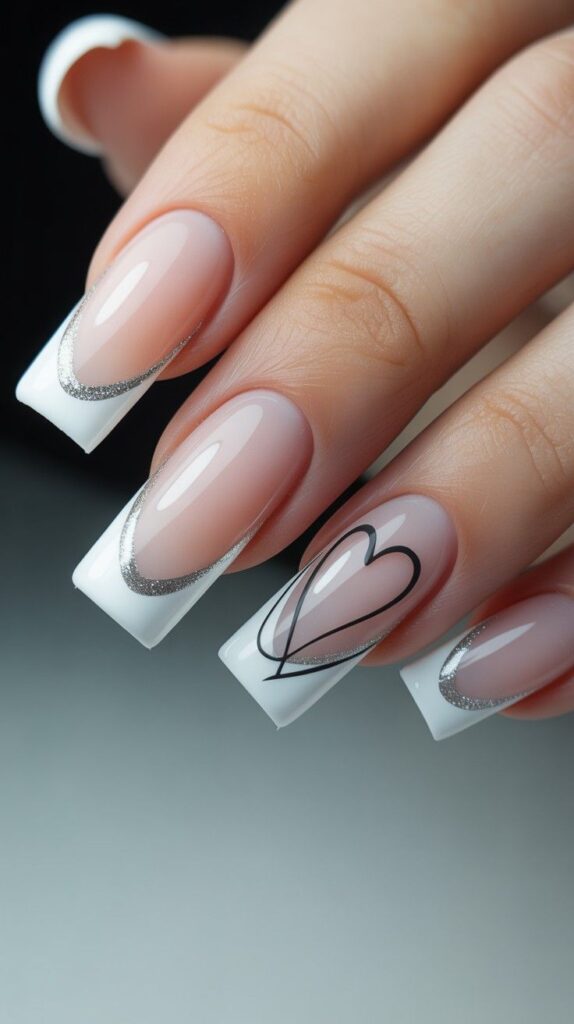 Soft nude-white short coffin nails with crisp white French tips accented by fine silver glitter borders and one accent finger featuring a bold black-outlined heart — elegant, modern, and full of refined contrast. The glossy finish enhances the metallic shimmer, and the compact shape ensures all-day wearability. Love, framed like a heirloom.