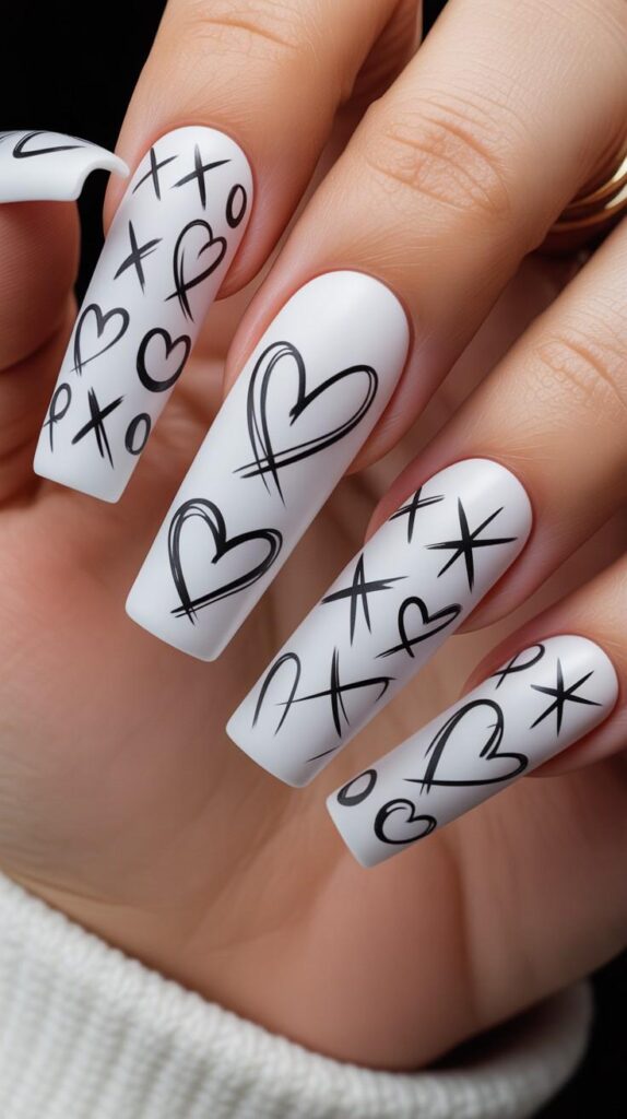 Pure white short stiletto nails adorned with expressive black brushstroke hearts, “XO” symbols, and freehand doodles — confident, artistic, and deeply personal. The matte-gloss hybrid finish adds texture without sacrificing shine, and the sharp shape commands presence. Romance, sketched with soul.