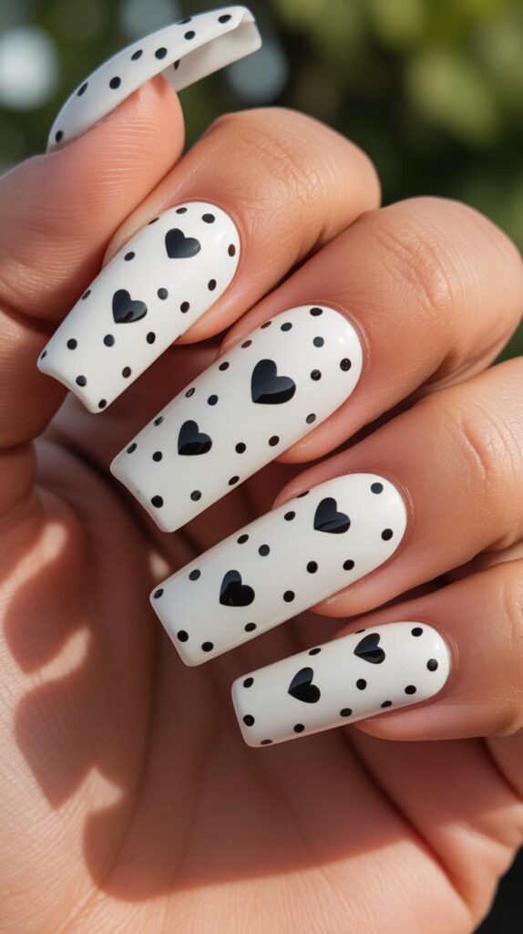 Glossy white long stiletto nails covered in scattered black polka dots and bold black hearts — modern, graphic, and effortlessly chic. The stark contrast feels editorial yet wearable, and the sharp shape adds confidence. Love, in黑白 poetry.