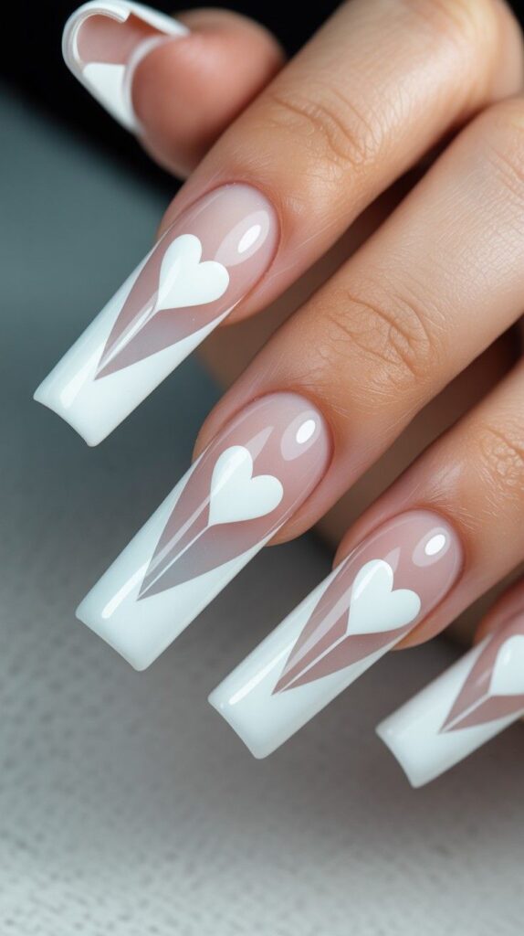 15) Geometric White Hearts on French Tips