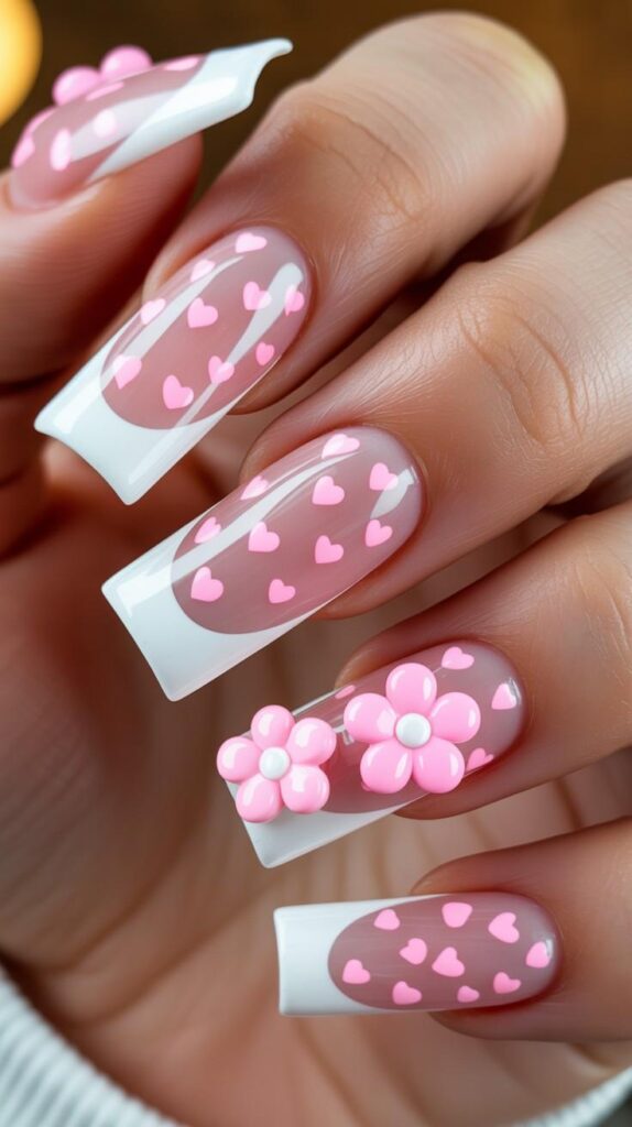 Nude-white short squoval nails with crisp white French tips adorned with scattered pink hearts and two accent fingers featuring raised 3D pink flowers with pearl centers — sweet, whimsical, and full of springtime joy. The glossy finish enhances the dimension, and the compact shape ensures durability. Like a bouquet, worn on your fingertips.