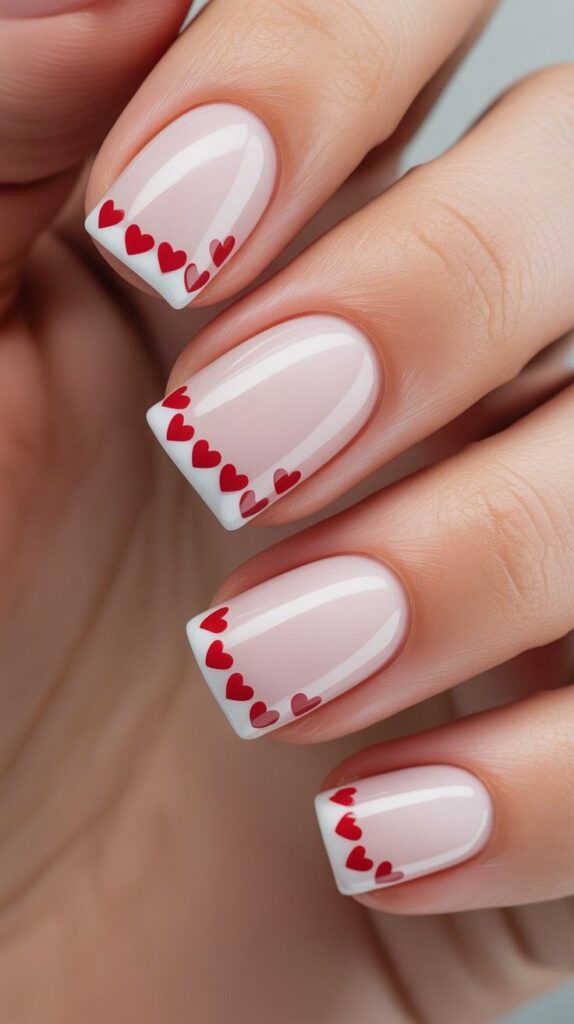 Nude-white short squoval nails with crisp white French tips adorned with a delicate scalloped border of mini crimson hearts — rhythmic, joyful, and full of romantic movement. The high-shine finish unifies the look, and the compact shape ensures comfort for typing, hugging, or holding coffee. Classic love, reimagined.