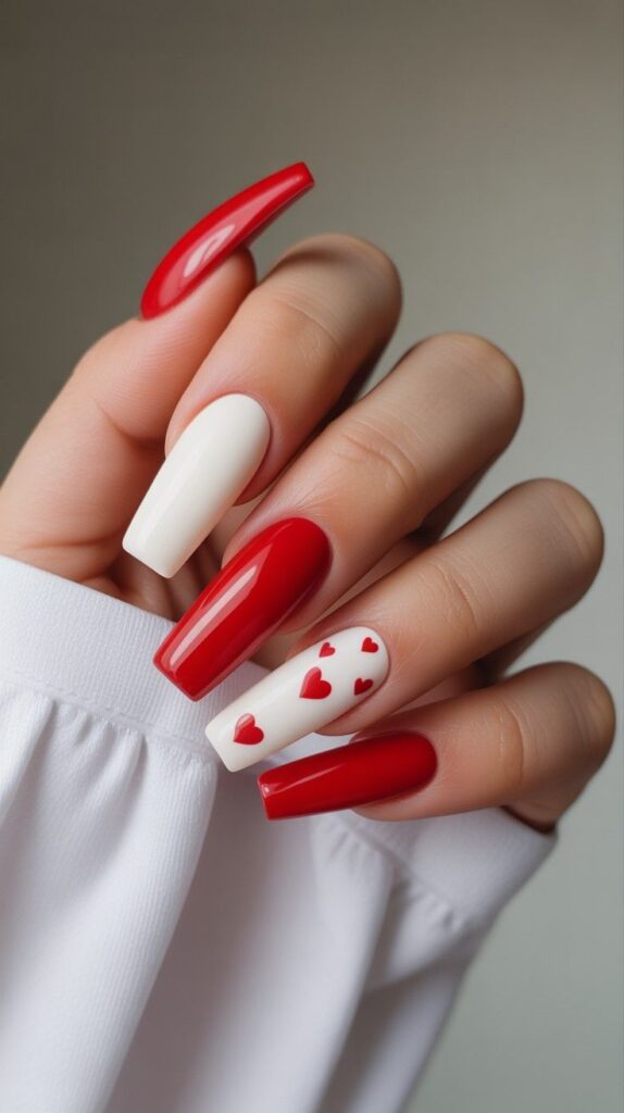 Glossy true red and pure white short coffin nails arranged in a striking alternating pattern, one accent finger featuring scattered mini red hearts on white — confident, modern, and deeply romantic. The high-shine finish unifies the palette, and the sharp shape commands presence. Passion, perfectly balanced.