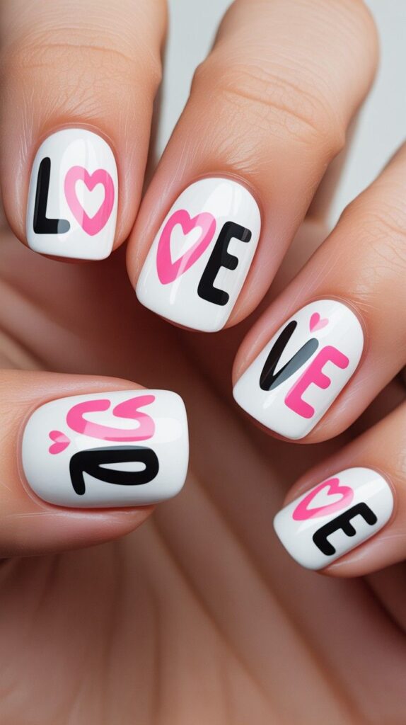 Pure white short oval nails featuring bold black-and-pink lettering spelling “L❤️VE” across four fingers — playful, graphic, and full of joyful declaration. The glossy finish makes the typography pop, and the short length keeps it practical for real life. Love, spelled out with confidence.
