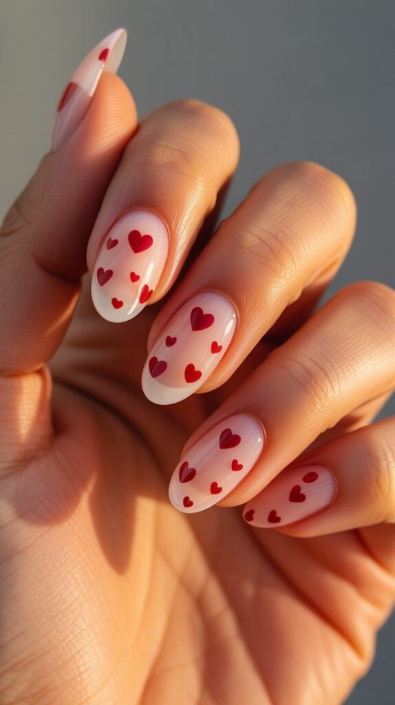 Delicate sheer nude-white short almond nails adorned with scattered mini red hearts that fade softly into the base — dreamy, romantic, and full of quiet depth. The high-shine finish unifies the look, and the compact shape ensures wearability. Like a memory you hold close.