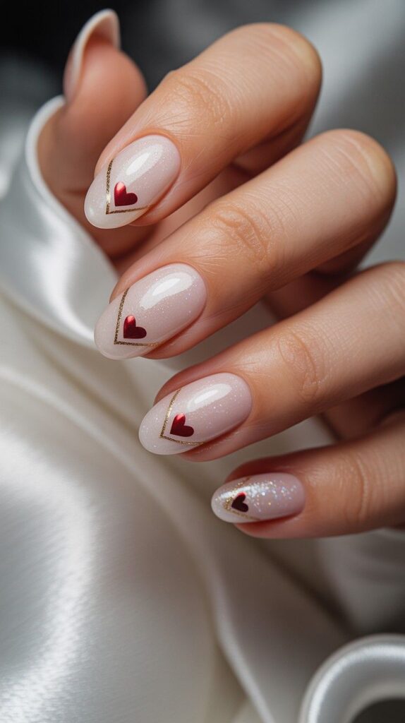 Soft ivory short almond nails featuring delicate red hearts framed by fine gold foil borders — elegant, luxurious, and full of refined detail. The subtle glitter shimmer adds dimension, and the compact shape ensures comfort for daily wear. Love, gilded with intention.