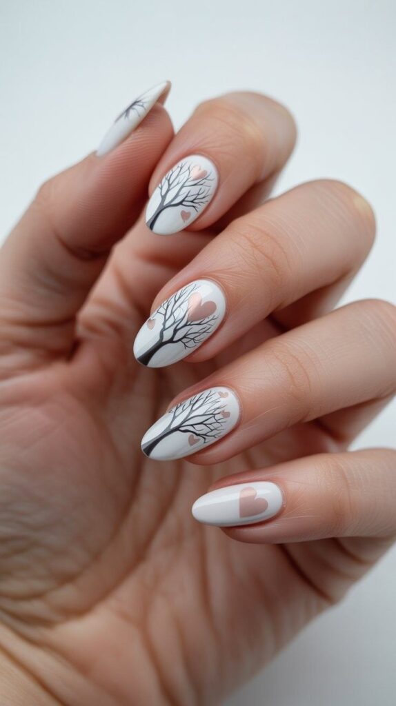Glossy white short almond nails featuring hand-drawn black silhouette trees with delicate blush-pink hearts nestled in the branches — poetic, serene, and full of symbolic hope. The high-shine finish enhances the contrast, and the compact shape ensures all-day wearability. Love, like winter turning to spring.