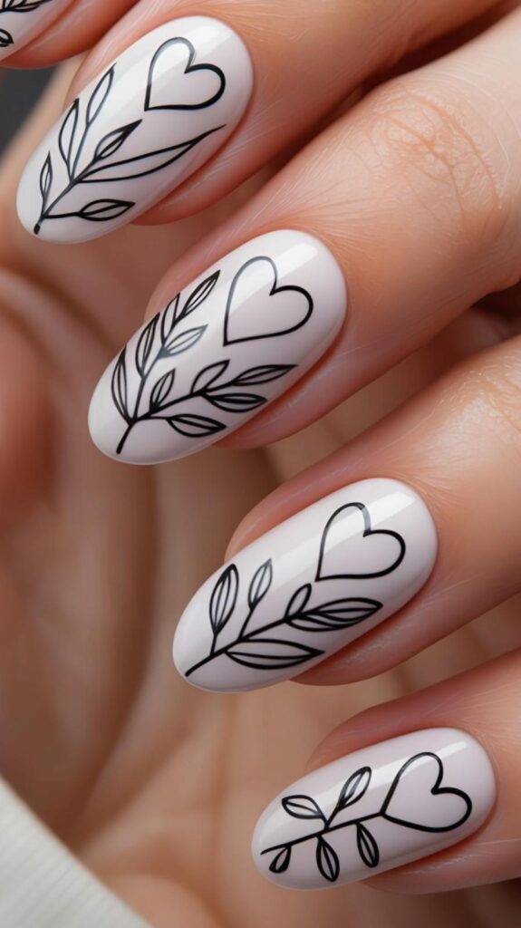 Glossy white short almond nails featuring delicate black-line botanical stems paired with minimalist outlined hearts — serene, organic, and full of quiet poetry. The high-shine finish makes the lines crisp, and the compact shape ensures comfort for daily life. Like a love letter from nature.