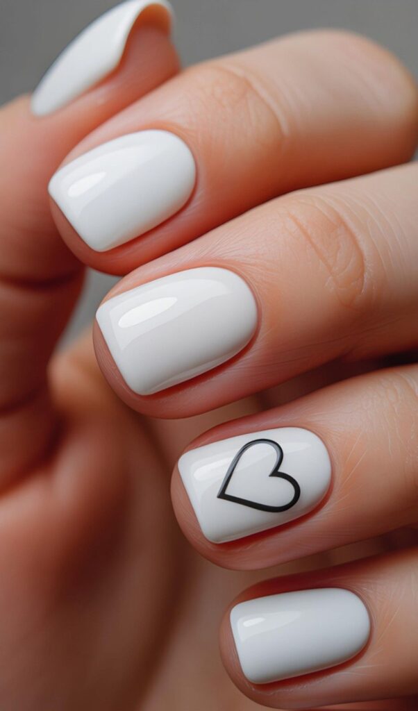 Flawless glossy white short rounded-square nails, one accent finger featuring a single delicate black-outlined heart — clean, modern, and deeply intentional. The high-shine finish enhances the simplicity, and the compact shape ensures all-day comfort. Love, distilled to its purest form.