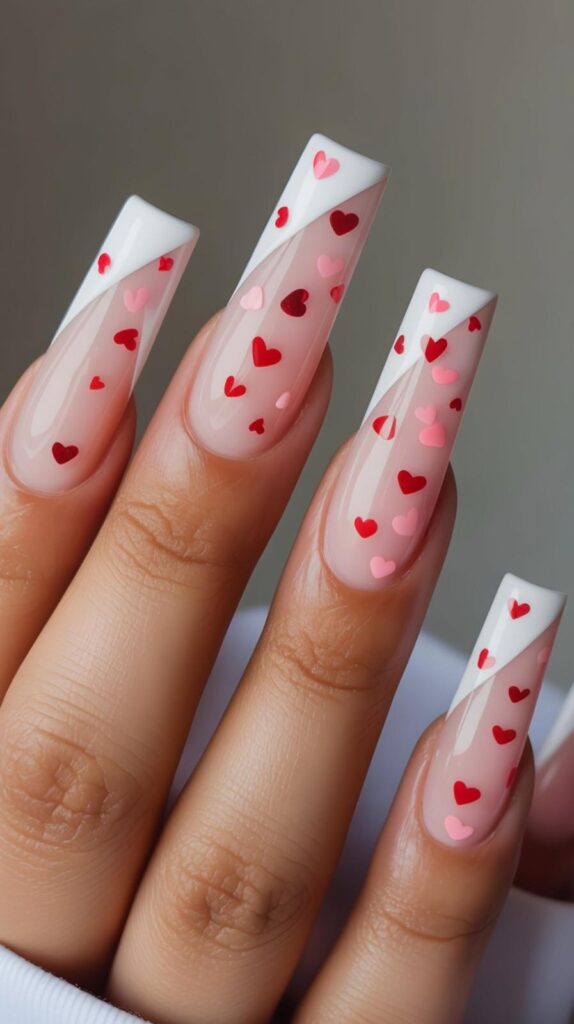 Nude-white short coffin nails with translucent tips scattered with mini red and blush hearts — joyful, airy, and full of gentle movement. The glossy finish makes the hearts gleam like candy, and the short length keeps it practical for real life. Like love caught in sunlight.