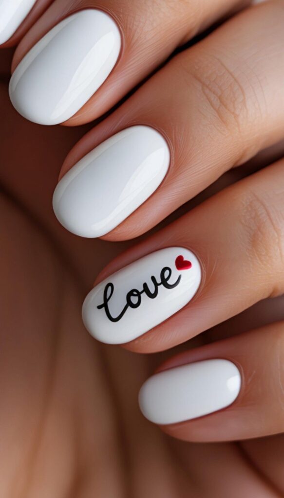 Flawless glossy white short rounded-square nails, one accent finger inscribed with delicate black cursive “love” and a tiny hand-painted red heart — serene, personal, and deeply intimate. The high-shine finish enhances the elegance, and the compact shape ensures all-day comfort. A whisper of devotion, perfectly polished.