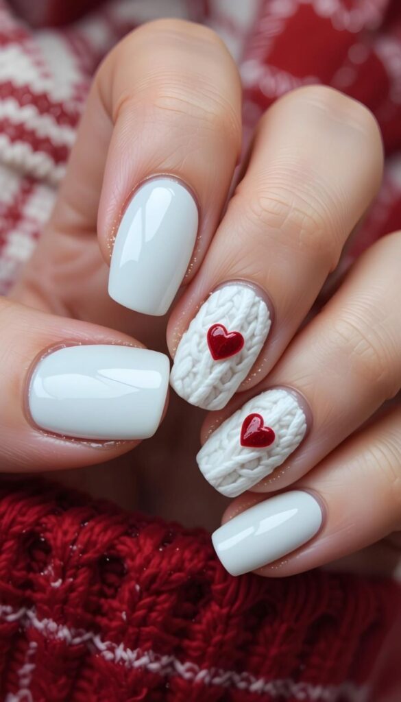 Pure white short oval nails paired with two accent fingers featuring 3D white knit-pattern textures and glossy crimson hearts — cozy, tender, and full of tactile warmth. The contrast between matte-knit and high-gloss heart feels deeply personal, and the compact shape ensures durability. Love, wrapped in sweater weather.