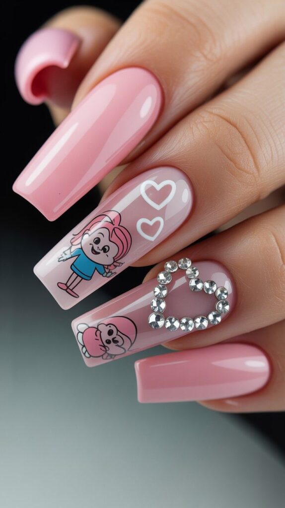 Soft pink short coffin nails featuring a hand-drawn cartoon girl with rosy cheeks and a blue dress, paired with a 3D heart outlined in silver rhinestones — sweet, sparkling, and full of personality. The glossy finish enhances the dimension, and the compact shape ensures comfort for daily wear. Like a childhood sketchbook, elevated.