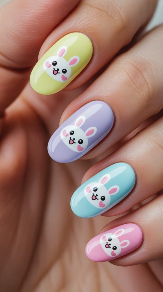 Short almond nails in soft pastel blocks—lemon yellow, lavender, sky blue, and baby pink—each featuring a smiling cartoon bunny with rosy cheeks, pink inner ears, and tiny hearts. The glossy finish enhances the plush charm, and the compact shape ensures comfort for daily life. Like a storybook character stepped onto your fingertips.