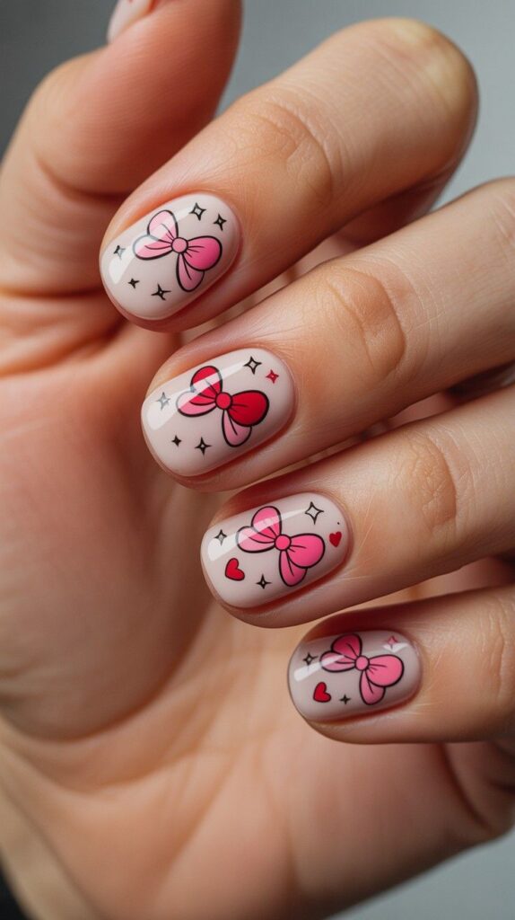 Soft beige short squoval nails featuring oversized pink cartoon bows with black outlines, tiny red hearts, and star-shaped glitter accents. The glossy finish makes the bows look plush and dimensional, and the short shape ensures longevity through hugs and hand-holding. Like a gift box tied with ribbon—and joy.