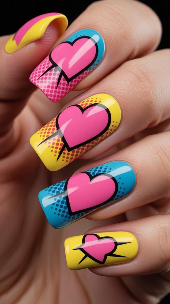 Bold yellow, pink, and turquoise short stiletto nails featuring oversized pink hearts with black outlines, halftone dots, and dynamic “zap” lines—inspired by classic comic-book energy. The glossy finish amplifies the vibrancy, and the sharp shape commands attention. This isn’t just cute—it’s iconic.