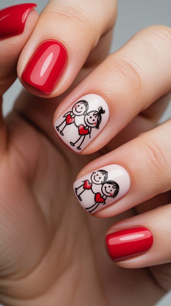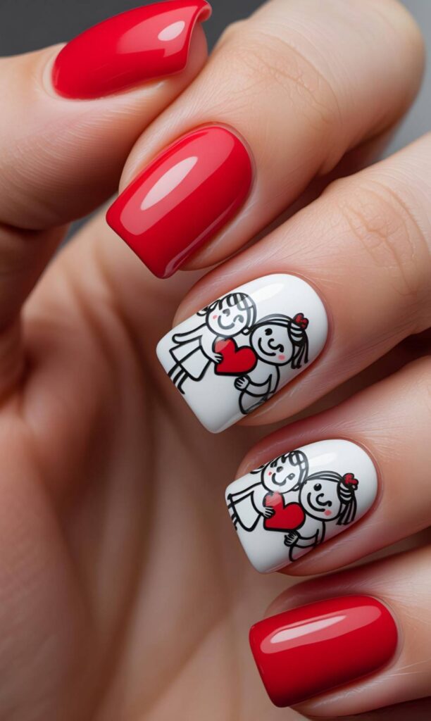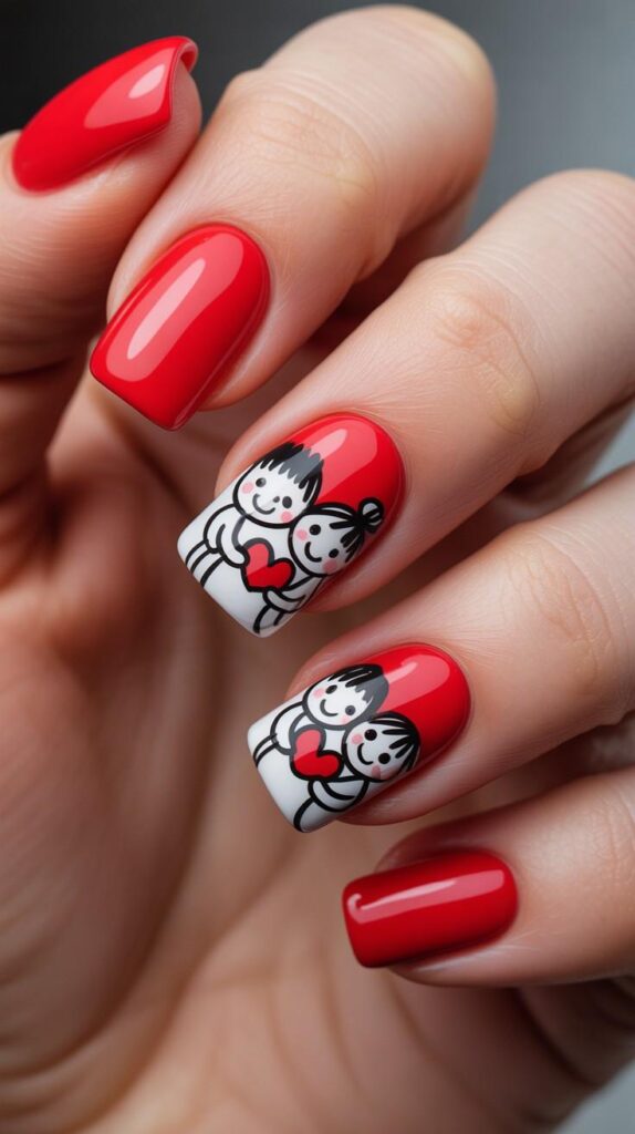 Vibrant red short squoval nails featuring white cartoon couples—holding hearts, blushing, and smiling—with bold black outlines. The high-contrast palette makes the figures pop like vintage comic panels, and the short length keeps it practical for real-world wear. Love, drawn in bold strokes.