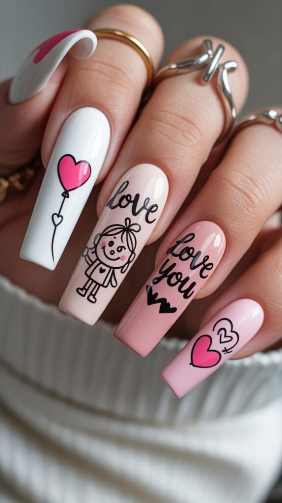 Glossy white and blush-pink short coffin nails adorned with hand-drawn stick-figure girls holding heart balloons, plus bold black cursive “love” and “love you” lettering. The contrast between minimalist line art and expressive typography feels fresh and heartfelt. Wearable storytelling at its sweetest.
