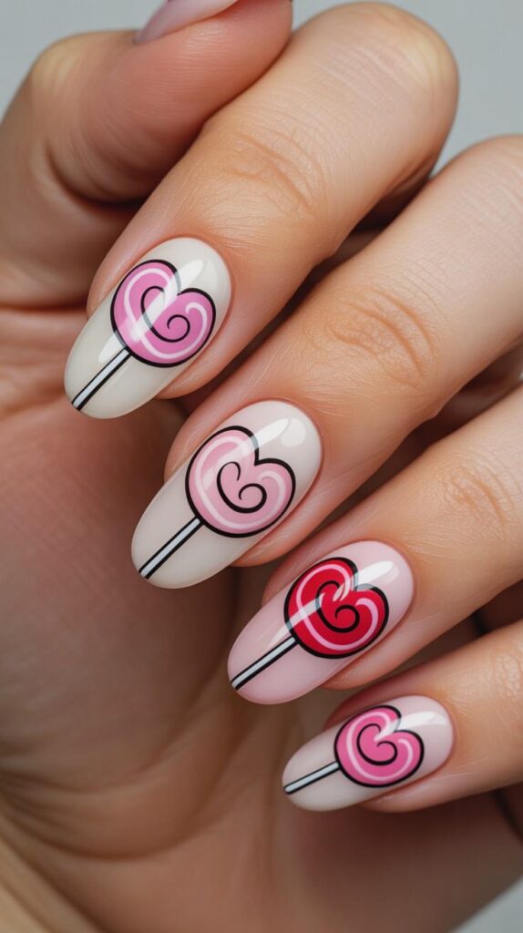 Delicate nude short almond nails decorated with glossy 3D-style lollipop hearts—pink swirls, red centers, and white sticks—drawn in bold cartoon lines. The playful contrast between soft base and vibrant detail feels joyful and nostalgic. Wearable whimsy at its finest.