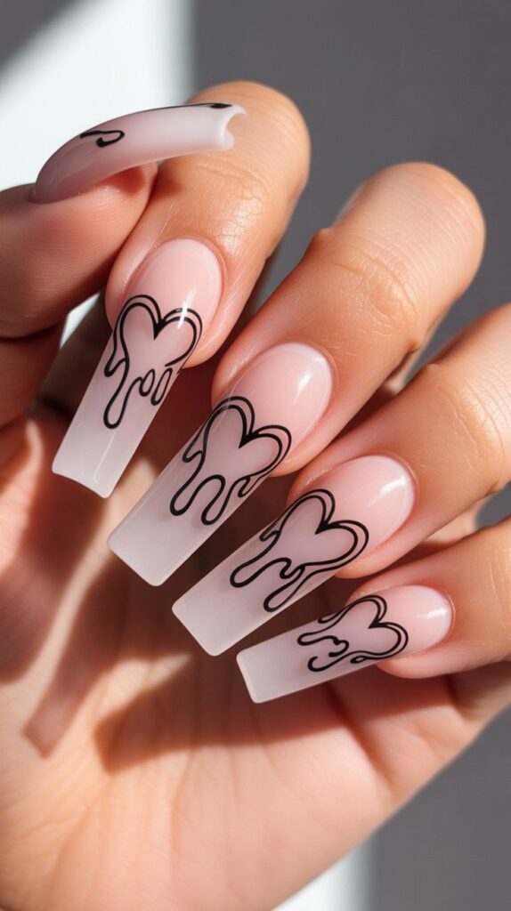 Sheer nude short coffin nails decorated with playful black-outlined “melting” hearts—dripping like candy wax—with glossy dimension and subtle shadowing. The whimsical imperfection feels modern and endearing, while the compact shape ensures durability. Love, in motion—and slightly messy.