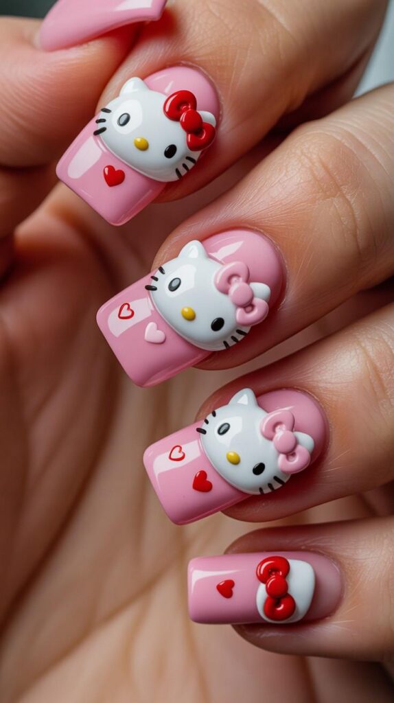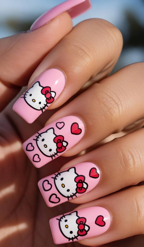 Soft pink short coffin nails adorned with classic Hello Kitty faces—white face, yellow nose, red bow—paired with floating hearts and subtle blush accents. The high-shine finish enhances the kawaii charm, and the short length keeps it practical without sacrificing cuteness. A timeless icon, reimagined for modern love.