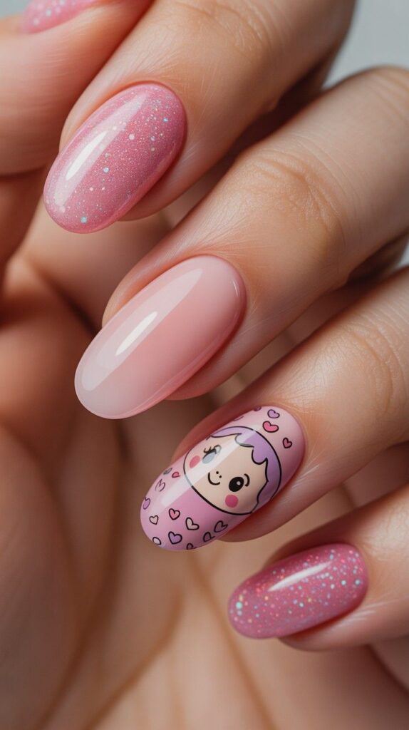 Soft pink ombre short oval nails with one accent finger featuring a hand-drawn cartoon girl with purple hair, blushing cheeks, and tiny hearts—paired with subtle iridescent glitter fade. The glossy finish enhances the dreamy texture, and the short length keeps it practical. Sweetness, with soul.