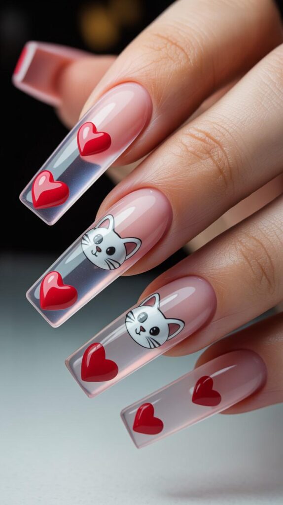 Sheer nude-pink short stiletto nails adorned with hand-drawn white cartoon cats (rosy cheeks, whiskers, tiny hearts) and glossy 3D red hearts — sweet, expressive, and full of personality. The high-shine finish enhances the charm, and the sharp shape adds modern edge. Love, delivered by feline friend.