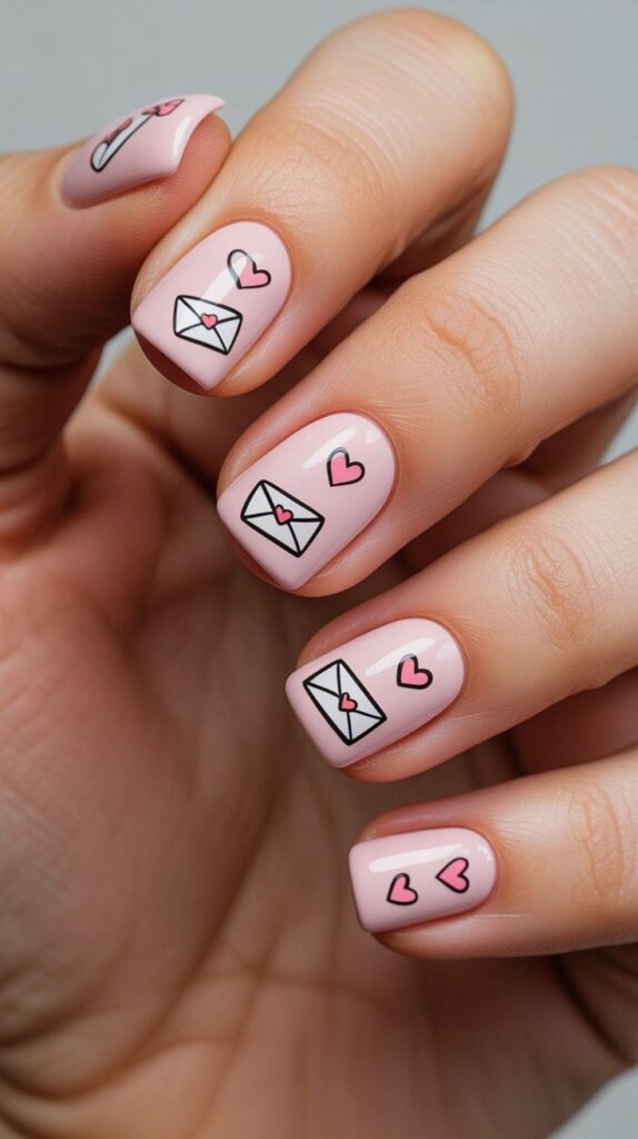 Delicate nude-pink short oval nails adorned with repeating cartoon love letters—pink envelopes, smiling stick figures, and floating hearts—in clean black outlines. The high-shine finish makes the doodles pop, and the short length keeps it practical for real life. A love story told in mini comic panels.
