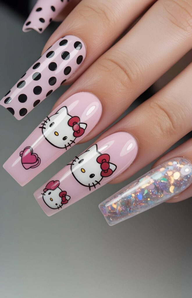 Vibrant pink short coffin nails with black polka dots, plus accents featuring Hello Kitty faces, tiny hearts, and one glitter-filled nail packed with iridescent confetti. The mix of textures (glossy, matte, sparkle) creates visual joy, and the short shape keeps it effortlessly wearable. Love, in full patterned celebration.