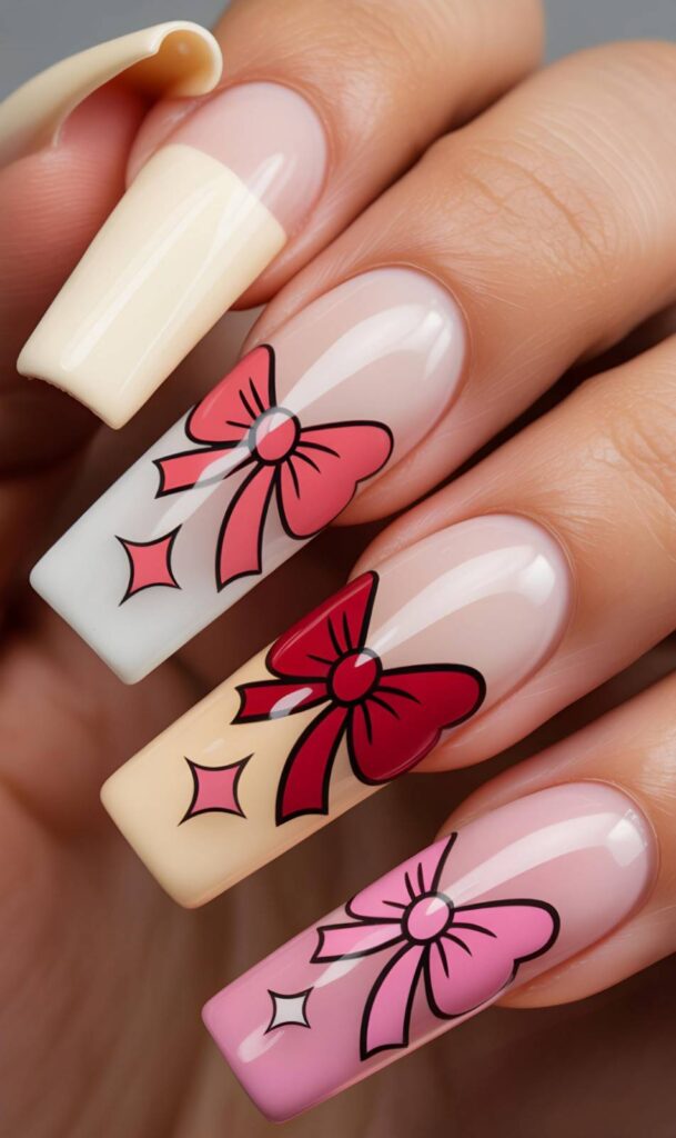 Soft cream, nude, and blush-pink short coffin nails featuring oversized cartoon bows in red, deep pink, and coral—each outlined in bold black, paired with sparkling star accents. The glossy finish makes the bows look plush and dimensional, and the compact shape ensures comfort for daily life. Like a gift box tied with joy.