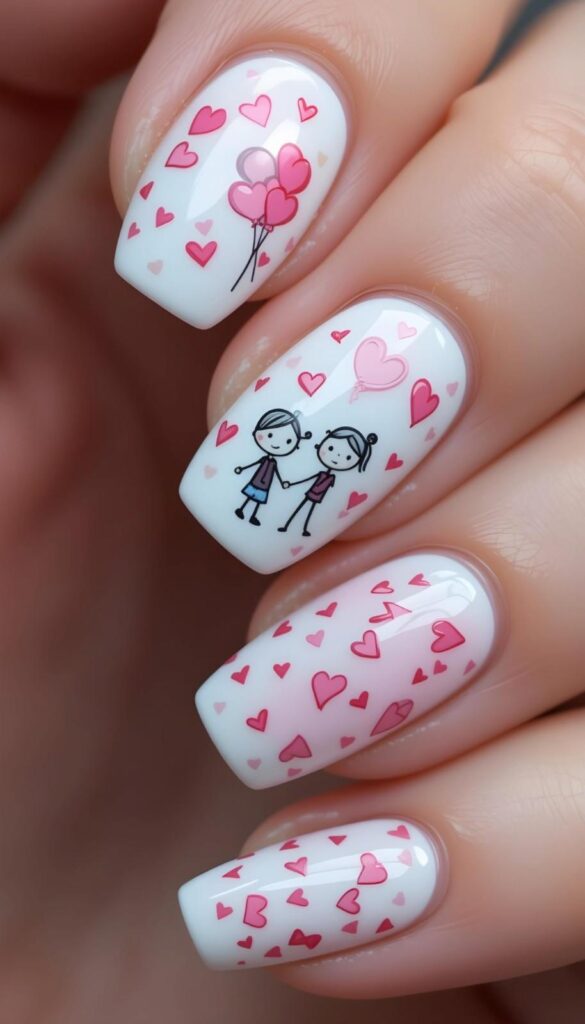 Glossy white short coffin nails covered in floating pink heart-shaped balloons and two stick-figure friends holding hands—playful, inclusive, and full of movement. The high-shine finish makes the balloons shimmer, and the compact shape ensures wearability. Love isn’t just romantic—it’s chosen, shared, and lifted high.