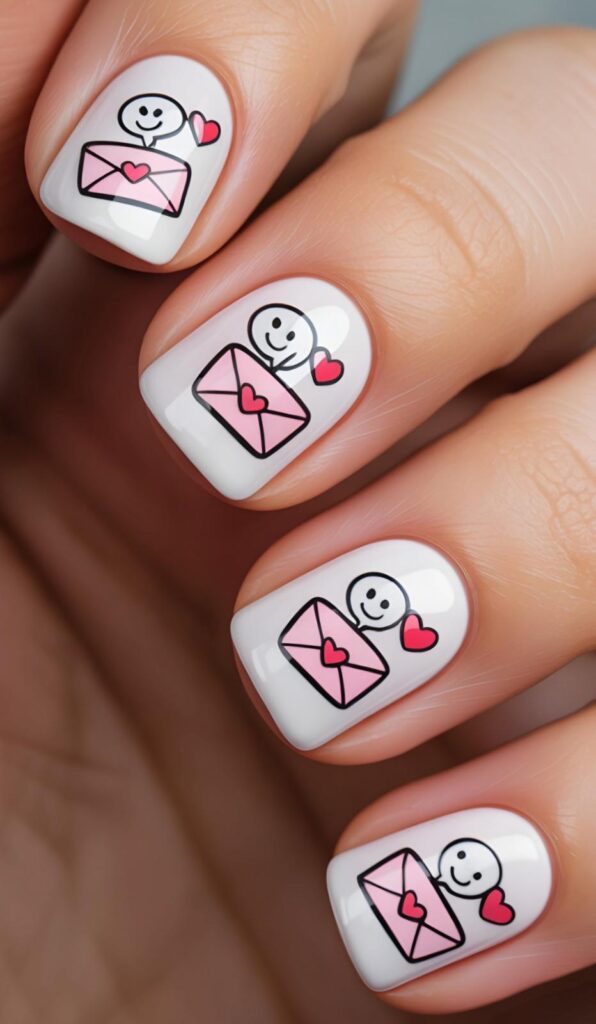 Nude-white short oval nails featuring cartoon-style love letters: a smiling stick figure peeking from a pink envelope with a heart seal, plus tiny floating hearts. The bold black outlines and glossy finish give it comic-book energy, while the compact shape ensures comfort for daily wear. Sweetness, delivered by post.