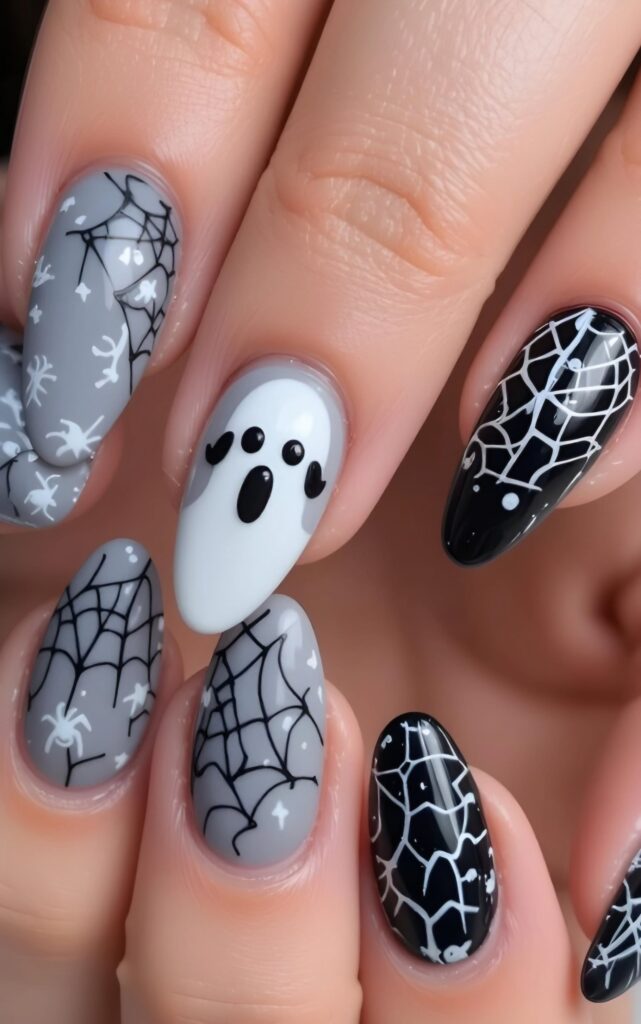 A dreamy grey glossy base frames four accent nails featuring delicate black spiderweb patterns — each dotted with tiny white spiders and stars. One nail steals the show with a large, cheerful white ghost decal, its simple black eyes and wavy bottom edge adding playful charm. The contrast is modern, edgy, and full of quiet mystery — perfect for those who love spooky elegance with a touch of whimsy.