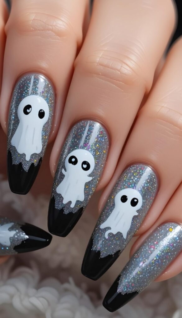 A dazzling silver glitter base glows with fine sparkle, while bold matte black tips add structure and drama. Each nail features a tiny white ghost with simple black eyes, peeking out from the glittery mist. The glossy finish enhances the depth of the glitter, making this look ideal for those who love high-impact glam without losing the soul of Halloween.