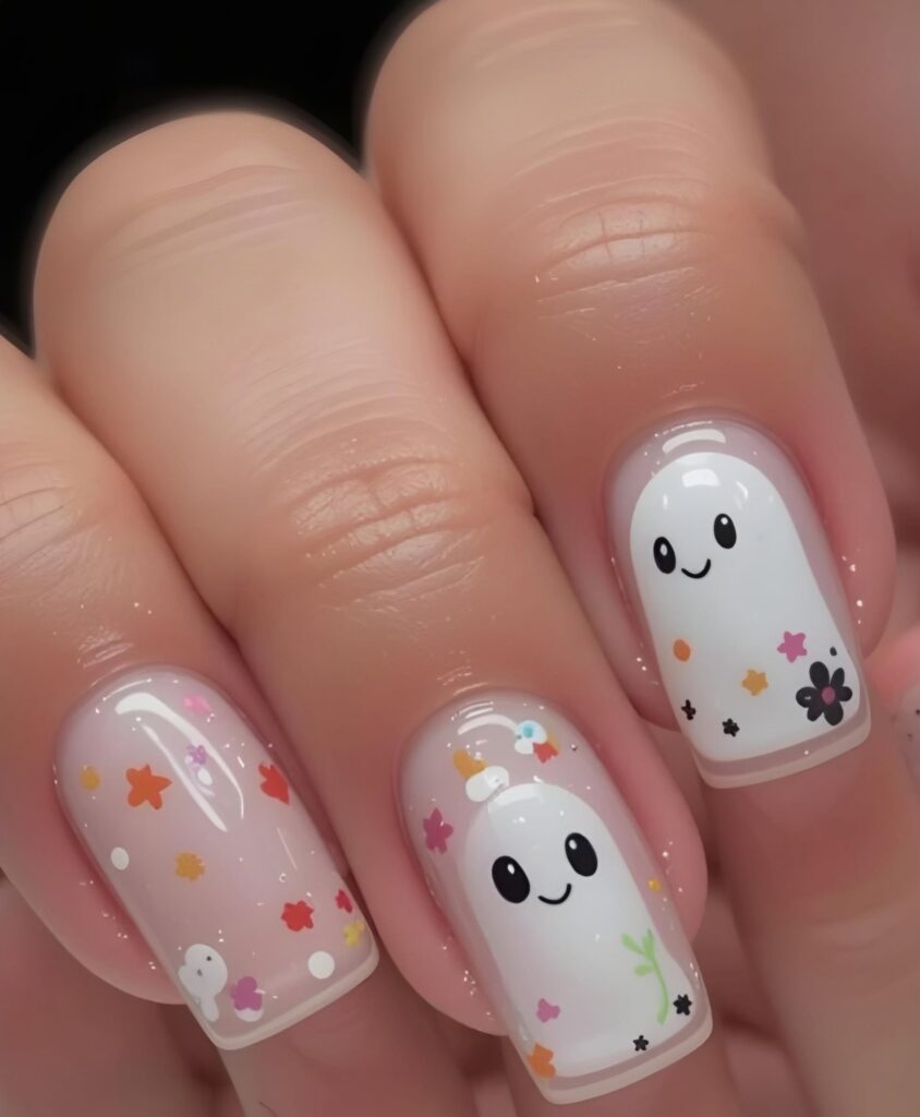 A sheer nude glossy base frames two accent nails featuring cheerful kawaii-style ghosts with rosy cheeks and heart-shaped eyes, while the others shimmer with scattered rainbow flowers and stars. The look is sweet, romantic, and full of autumn joy — like wearing a candy-colored spell on your fingertips.