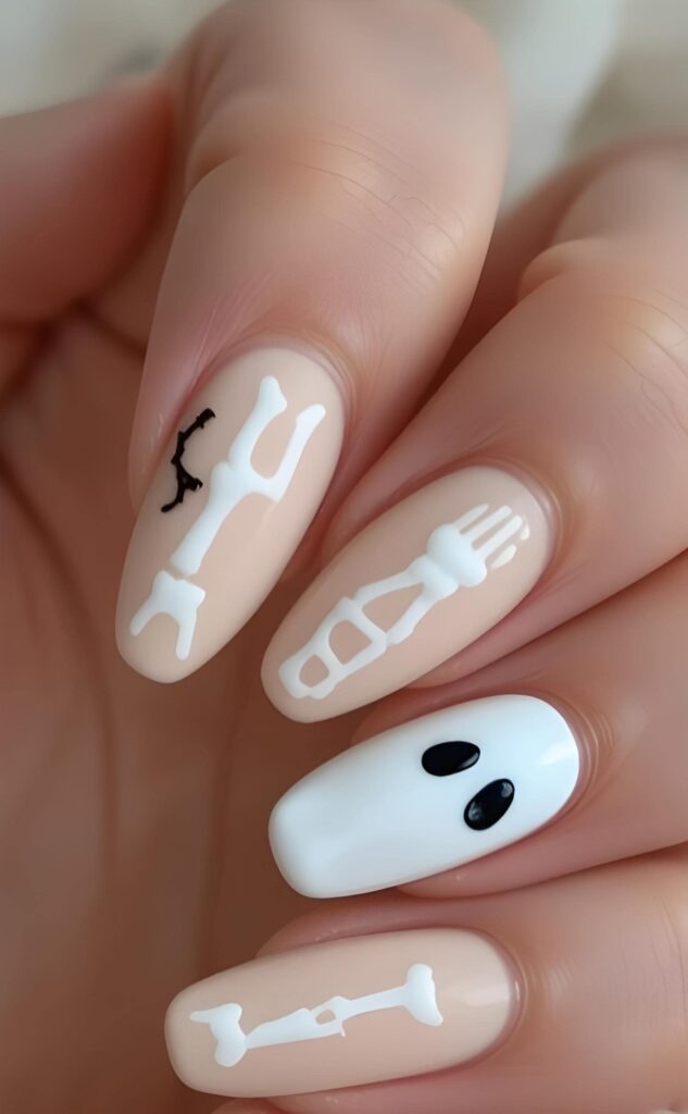 A clean nude glossy base frames four accent nails featuring delicate white skeleton bones — each painted with fine brush strokes for a realistic, yet playful look. One nail features a simple white ghost with black eyes, adding just enough spooky flair to keep it fun. The look is elegant without being overwhelming, perfect for those who love subtle texture with a touch of Halloween magic.