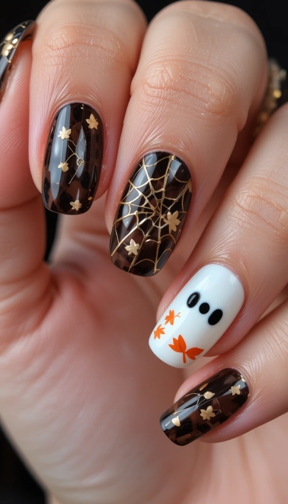 A deep brown glossy base frames two accent nails — one featuring a delicate gold spiderweb pattern, the other showcasing a white ghost surrounded by orange autumn leaves. Scattered gold flecks add a touch of sparkle, making this look perfect for those who love nature-inspired drama with a hint of spooky glam.